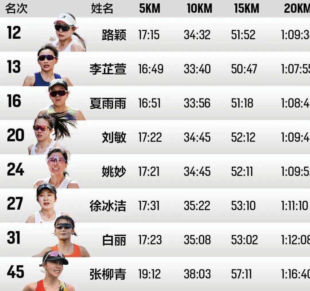 10公里时,李芷萱紧咬细田爱,10公里用时33分39秒,3分22的配速稍快。夏雨雨用时33分56秒,路颖用时34分32秒,刘敏和姚妙依旧跑在一起,用时34分45秒。15公里,细田爱和李芷萱依旧处于女子第二集团,李芷萱15公里用时50分47秒。整个前半程,女子选手方面相对稳定。科斯盖和克贝德继续领跑,半程用时1小时07分36秒。中国女选手中,李芷萱半马用时1小时11分39秒、夏雨雨用时1小时12分33秒、路颖用时1小时13分20秒、刘敏1小时13分38秒、姚妙1小时13分40秒、徐冰洁1小时15分。一直以“安全完赛”为目标的李芷萱到半程后还安慰自己,“希望后面可以不退赛”。